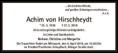 Wir trauern um Herrn Achim von Hirschheydt geb. Knüpfer Schriftsteller * 25.05.1936 † 27.03.2018 |
