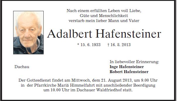 Gottesdienst am Mittwoch, dem 21. August 2013, um 09:00 Uhr in Mariä Himmelfahrt Beerdigung am Mittwoch, dem 21. August 2013, um 10:00 Uhr im Dachauer Waldfriedhof