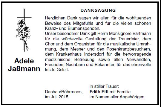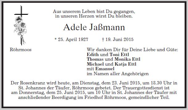 Wir trauern um Frau Adele Jaßmann geb. Doneis Hausfrau * 25.04.1927 † 19.06.2015 |