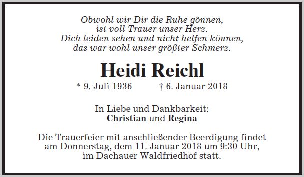 Die Trauerfeier mit anschließender Beerdigung ist am Donnerstag, dem 11. Januar 2018, um 09:30 Uhr im Dachauer Waldfriedhof |