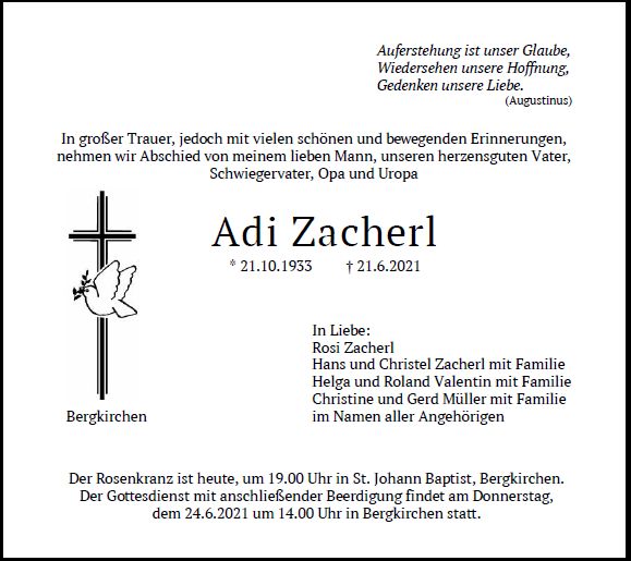 Gottesdienst am Donnerstag, dem 24. Juni 2021, um 14:00 Uhr in St. Johann Baptist. Beerdigung am Donnerstag, dem 24. Juni 2021, um 14:45 Uhr in Bergkirchen.