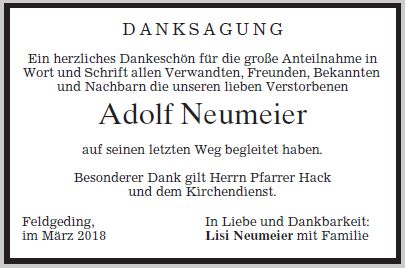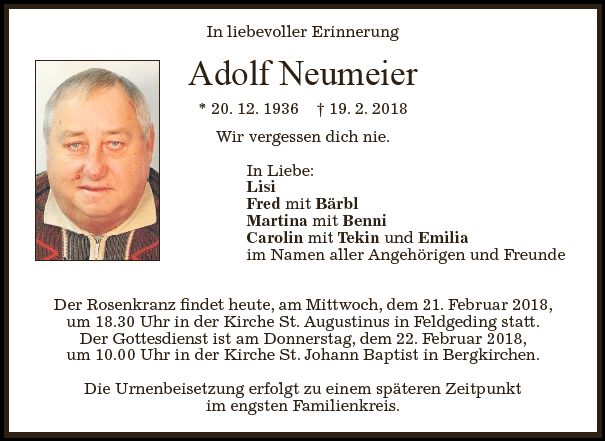 Der Rosenkranz ist am Mittwoch, dem 21.02.2018, um 18:00 Uhr in der Kirche St. Augustinus in Feldgeding. Der Gottesdienst findet am Donnerstag, dem 22.02.2018, um 10:00 Uhr in der Kirche St. Johann Baptist in Bergkirchen statt. Die Urnenbeisetzung erfolgt zu einem späteren Zeitpunkt im engsten Familienkreis. |