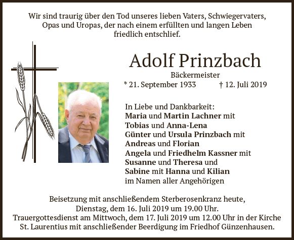 Gottesdienst am Mittwoch, dem 17. Juli 2019, um 12:00 Uhr in St. Laurentius in Günzenhausen Amschließend Beerdigung im Friedhof Günzenhausen