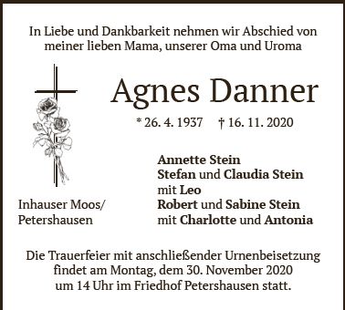 Trauerfeier mit anschließender Urnenbeisetzung am Montag, dem 30. November 2020, um 14:00 Uhr im Friedhof Petershausen.