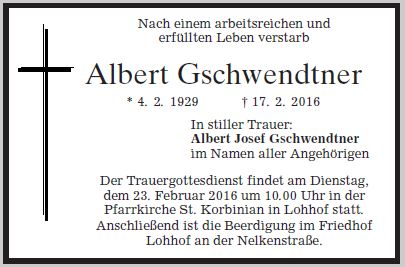 Gottesdienst am Dienstag, dem 23. Februar 2016, um 10:00 Uhr in St. Korbinian in Lohhof Anschließend Beerdigung am Dienstag, dem 23. Februar 2016, um 11:00 Uhr im Friedhof Lohhof an der Nelkenstraße