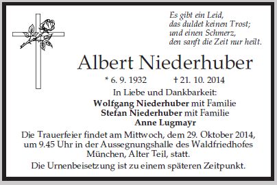 Trauerfeier am Mittwoch, dem 29. Oktober 2014, um 09:45 Uhr im Münchner Waldfriedhof Alter Teil Beisetzung am Dienstag, dem 25. November 2014, um 09:45 Uhr im Münchner Waldfriedhof Alter Teil