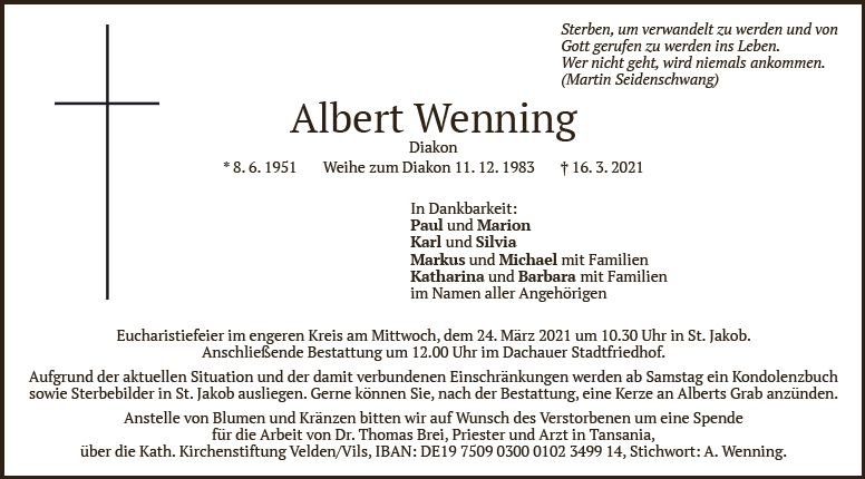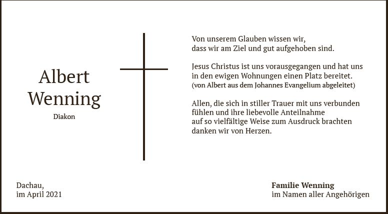Wir trauern um Herrn Diakon Albert Wenning * 08.06.1951 † 16.03.2021 |