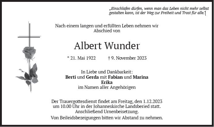 Wir trauern um Herrn Albert Wunder * 21.05.1922 † 09.11.2023 |