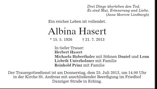 Gottesdienst am Donnerstag, dem 25. Juli 2013, um 14:00 Uhr in St. Andreas, Eching Beerdigung am Donnerstag, dem 25. Juli 2013, anschließend Friedhof Eching Danziger Straße