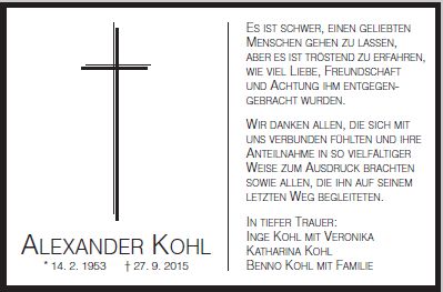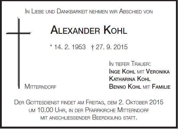 Gottesdienst am Freitag, dem 2. Oktober 2015, um 10:00 Uhr in St. Nikolaus Mitterndorf, mit anschließender Beerdigung.
