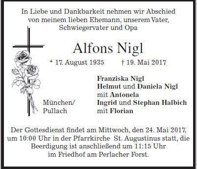 Gottesdienst am Mittwoch, dem 24. Mai 2017, um 10:00 Uhr in St. Augustinus, München, Bestattung anschließend um 11:15 Uhr im Friedhof am Perlacher Forst |