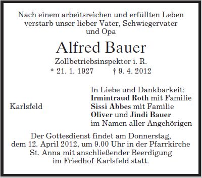 Gottesdienst am Donnerstag, dem 12. April 2012 um 09:00 in St. Anna anschließend Beerdigung im Friedhof Karlsfeld