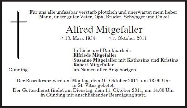 Gottesdienst am Dienstag, dem 11. Oktober 2011, um 14:00 Uhr in St. Vitus Beerdigung anschließend um 14:45 Uhr im Friedhof Günding