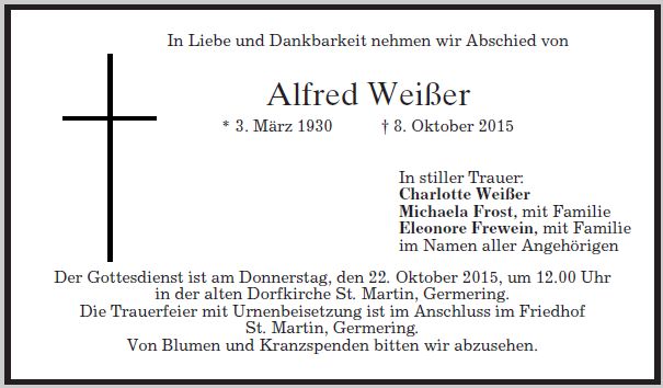 Gottesdienst ist am Donnerstag, dem 22. Oktober 2015, um 12:00 Uhr in der alten Dorfkirche St. Martin, Germering Die Trauerfeier und Urnenbeisetzung ist anschließend, im Friedhof St. Martin, Germering