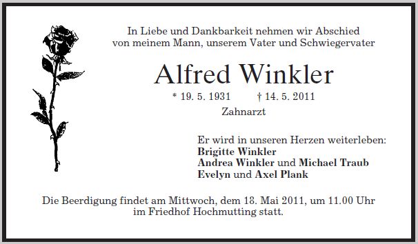 Beerdigung am Mittwoch, dem 18. Mai 2011, um 11:00 Uhr im Friedhof Hochmutting