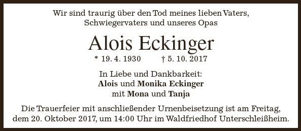 Wir trauern um Herrn Alois Eckinger Spengler / Betriebsmeister * 19.04.1930 † 05.10.2017 |