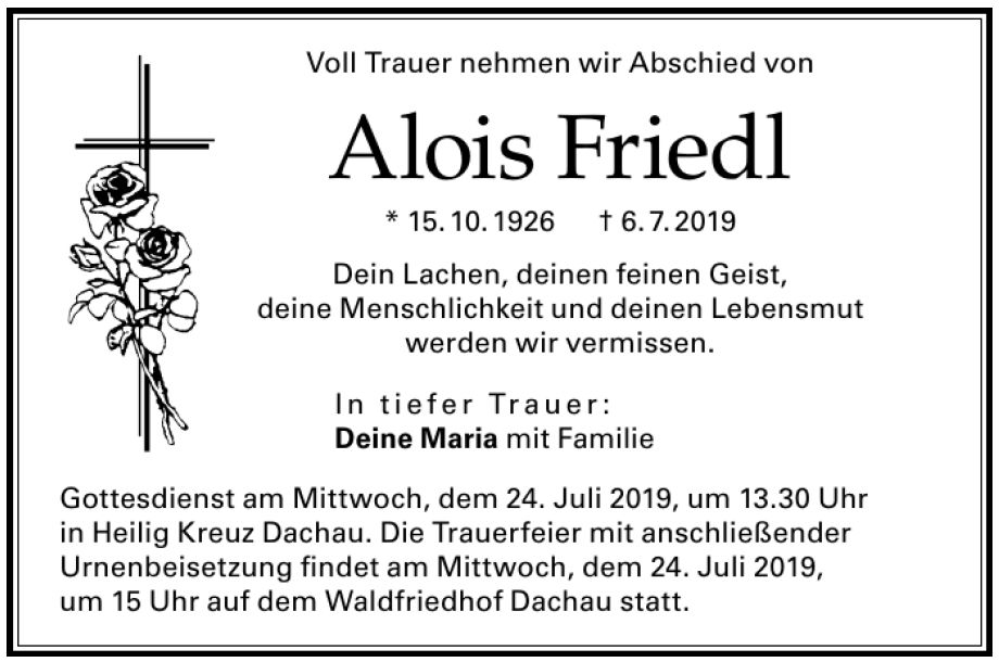 Gottesdienst am Mittwoch, dem 24. Juli 2019, um 13:30 Uhr in Hl. Kreuz in Dachau. Die Trauerfeier mit anschließender Urnenbeisetzung findet am Mittwoch, dem 24. Juli 2019 um 15:00 Uhr im Dachauer Waldfriedhof statt.