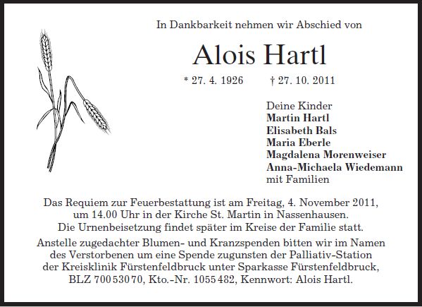 Der Gottesdienst ist am Freitag, dem 4. November 2011, um 14:00 Uhr in der Kirche St. Martin, in Nassenhausen. Die Urnenbeisetzung findet später im Kreise der Familie statt.