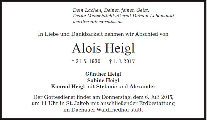 Gottesdienst am Donnerstag, dem 6. Juli 2017, um 11:00 Uhr in St.Jakob, Dachau. Beerdigung am Donnerstag, dem 6. Juli 2017, um 12:00 Uhr im Dachauer Waldfriedhof.