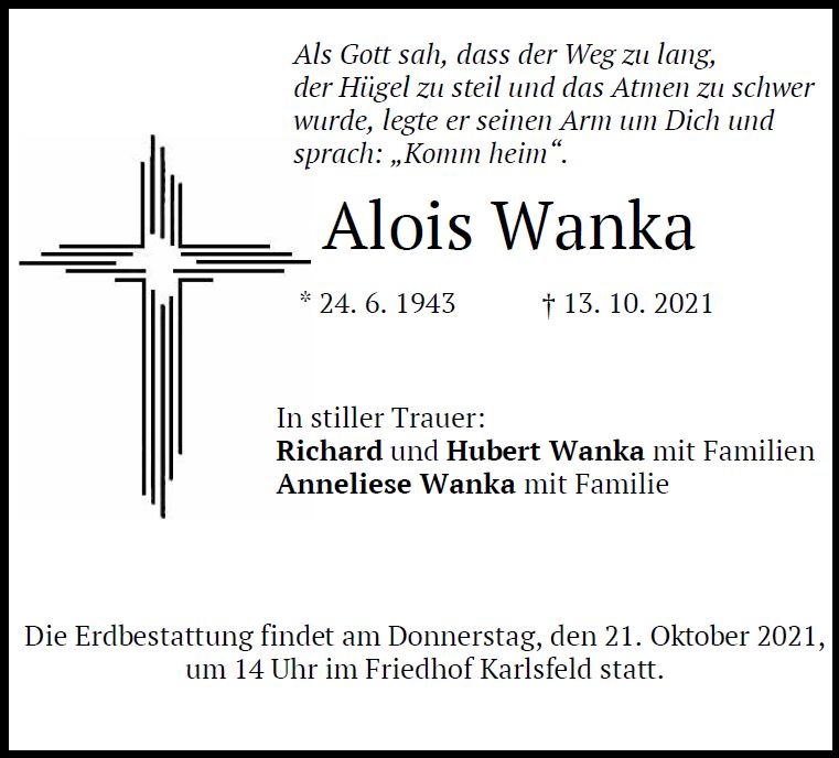 Beerdigung am Donnerstag, dem 21. Oktober 2021, um 14:00 Uhr im Friedhof Karlsfeld.