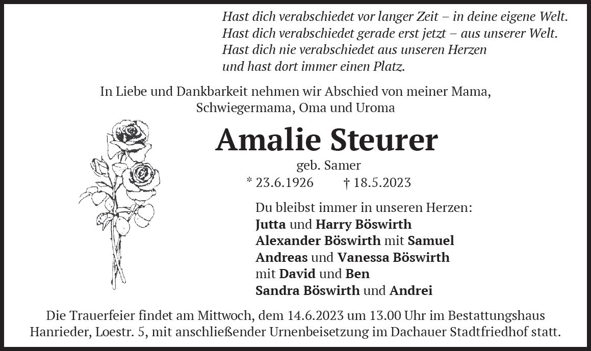 Trauerfeier am Freitag, dem 14. Juni 2023, um 13:00 Uhr im Hanrieder Bestattungshaus, Loestr. 5, Dachau. Beisetzung am Freitag, dem 14. Juni 2023, um 13:30 Uhr im Dachauer Stadtfriedhof.