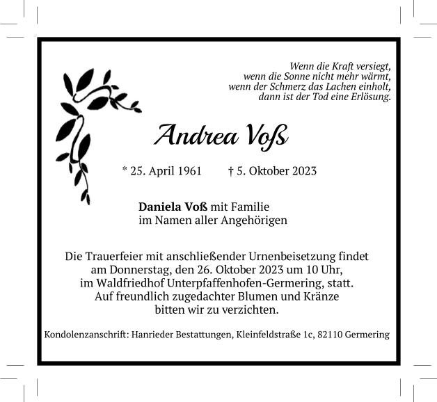Wir trauern um Frau Andrea Voß * 25.04.1961 † 05.10.2023 |