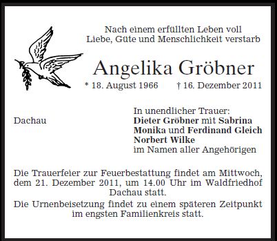 Trauerfeier am Mittwoch, dem 21. Dezember 2011, um 14:00 Uhr im Dachauer Waldfriedhof Die Urnenbeisetzung findet zu einem späteren Zeitpunkt im engsten Familienkreis statt.