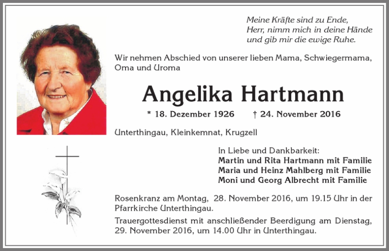 Der Gottesdienst findet am Dienstag, 29.11.2016 um 14 Uhr in St. Nikolaus, Unterthingau statt. Die Beerdigung ist im Anschluss im Friedhof Unterthingau.