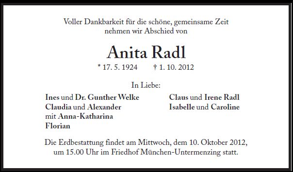 Beerdigung am Mittwoch, dem 10. Oktober 2012, um 15:00 Uhr im Friedhof München-Untermenzing.