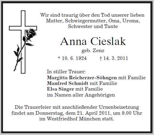 Die Trauerfeier mit anschließender Urnenbeisetzung findet am Donnerstag, dem 21.04.2011, um 9:00 Uhr im Westfriedhof München statt.