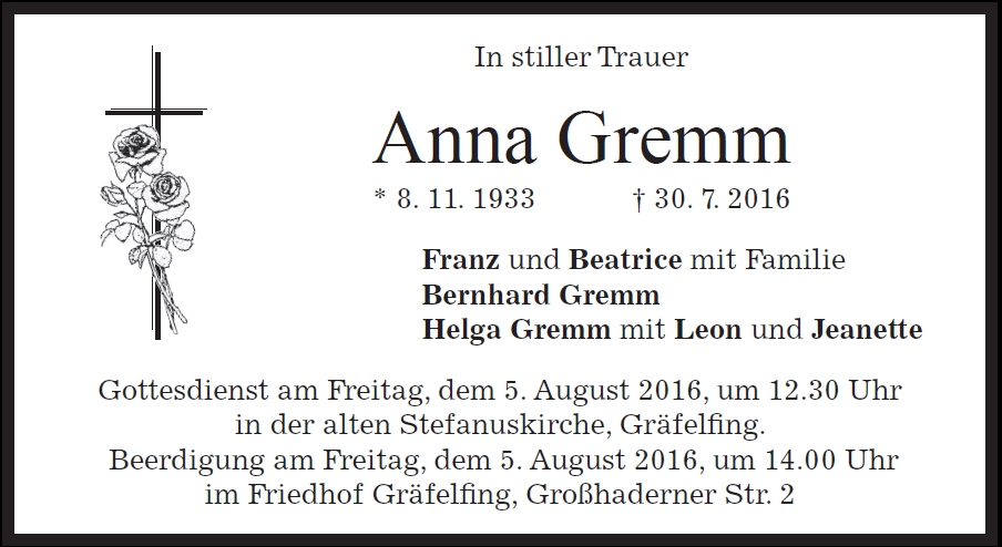 Gottesdienst am Freitag, dem 5.8.2016, um 12.30 Uhr in der alten Stefanuskirche, Gräfelfing Beerdigung am Freitag, dem 5.8.2016, um 14.00 Uhr im Friedhof Gräfelfing