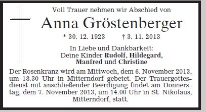 Wir trauern um Frau Anna Gröstenberger geb. Treiner Hausfrau * 30.12.1923 † 03.11.2013 |