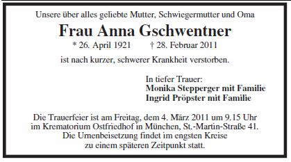 Wir trauern um Frau Anna Gschwentner geb. Bauer Kaufmännische Angestellte * 26.04.1921 † 28.02.2011 |