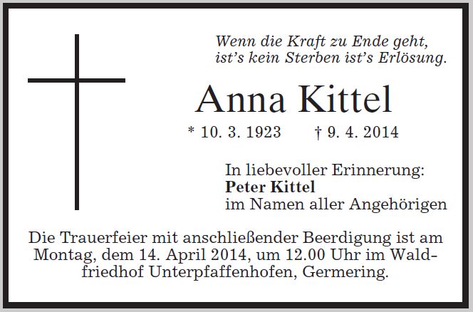 Trauerfeier am Montag, dem 14. April 2014, um 12:00 Uhr im Germering - Waldfriedhof Unterpfaffenhofen Beerdigung am Montag, dem 14. April 2014, um 12:30 Uhr im Germering - Waldfriedhof Unterpfaffenhofen