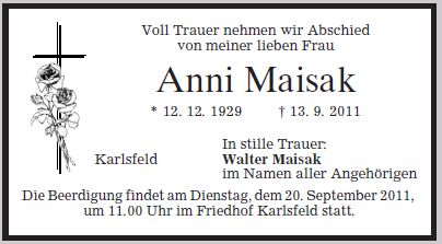Beerdigung am Dienstag, dem 20. September 2011, um 11:00 Uhr im Friedhof in Karlsfeld