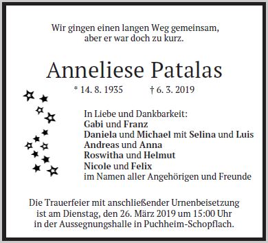 Die Trauerfeier mit anschließender Urnenbeisetzung war am Dienstag, dem 26. März 2019, um 15:00 Uhr in Puchheim Schopflach.