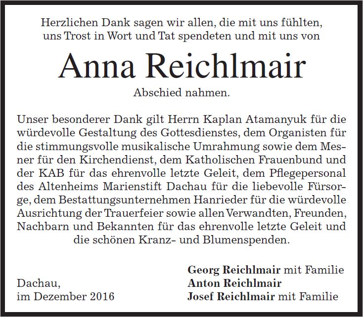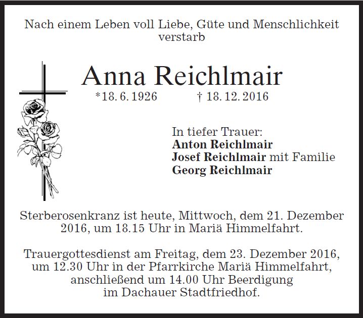 Trauergottesdienst am Freitag, dem 23. Dezember 2016, um 12.30 Uhr in der Pfarrkirche Mariä Himmelfahrt, anschließend um 14.00 Uhr Beerdigung im Dachauer Stadtfriedhof. |