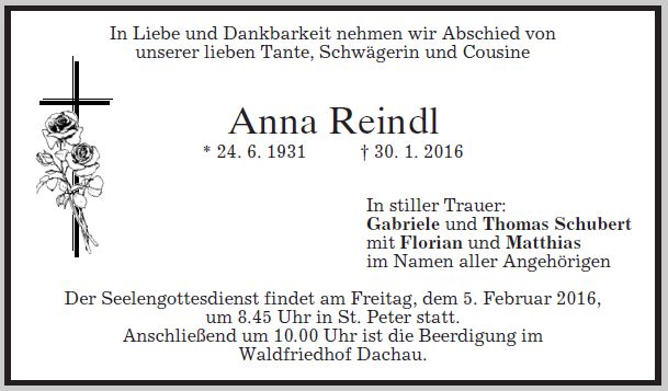 Gottesdienst am Freitag, dem 5. Februar 2016, um 08:45 Uhr in St. Peter. Anschließend um 10:00 Uhr Beerdigung im Dachauer Waldfriedhof