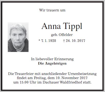Trauerfeier mit anschließender Urnenbeisetzung am 10.11.2017 um 15:00 Uhr im Dachauer Waldfriedhof.