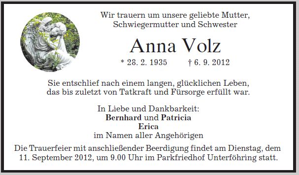 Wir trauern um Frau Anna Volz geb. Westermaier Gymnasiallehrerin * 28.02.1935 † 06.09.2012 |