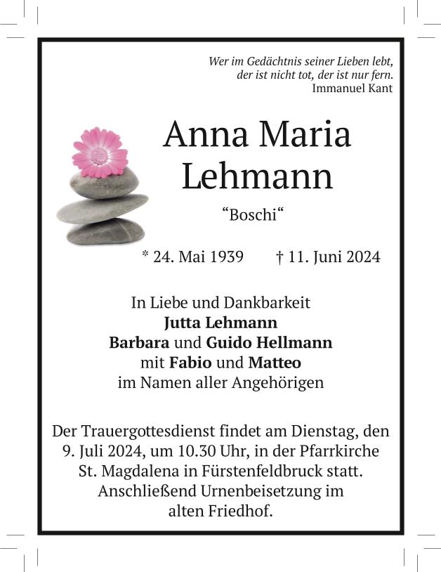 Der Trauergottesdienst findet am Dienstag, den 9. Juli 2024 um 10.30 Uhr, in der Pfarrkirche St. Magdalena in Fürstenfeldbruck statt. Anschließend Urnenbeisetzung im Alten Friedhof Fürstenfeldbruck.