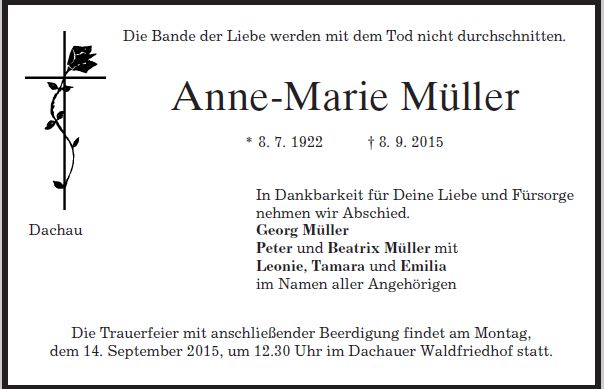 Die Trauerfeier mit anschließender Beerdigung ist am Montag, dem 14. September 2015, um 12:30 Uhr im Dachauer Waldfriedhof. |