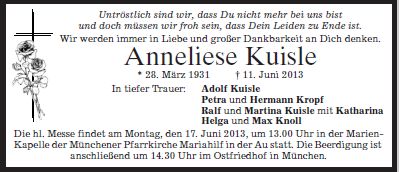 Gottesdienst am Montag, dem 17. Juni 2013, um 13:00 Uhr in Mariahilf, Mariahilfplatz, München Beerdigung am Montag, dem 17. Juni 2013, um 14:30 Uhr im Münchener Ostfriedhof