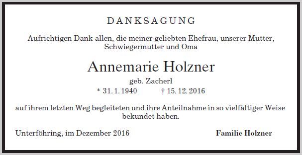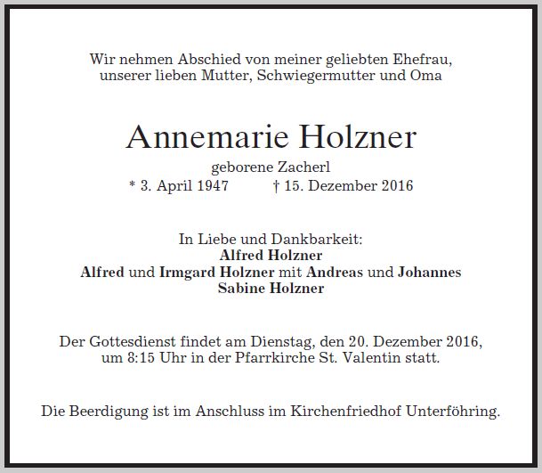 Wir trauern um Frau Annemarie Holzner-Zacherl geb. Zacherl * 03.04.1947 † 15.12.2016 |