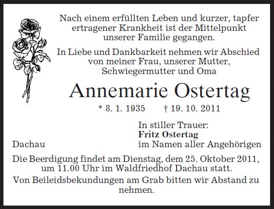 Gottesdienst : Dienstag, 25.10.2011 um 11:00 Uhr mit anschließender Beerdigung im Dachauer Waldfriedhof