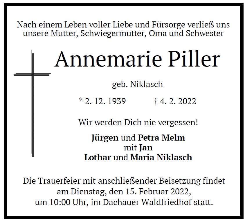 Wir trauern um Frau Annemarie Piller geb. Niklasch Einzelhandelskauffrau * 02.12.1939 † 04.02.2022 |