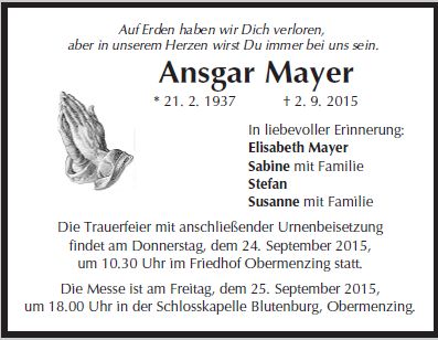 Gottesdienst am Freitag, dem 25. September 2015, um 18:00 Uhr in der Schlosskapelle Blutenburg. Trauerfeier mit anschließender Urnenbeisetzung am Donnerstag, dem 24. September 2015, um 10:30 Uhr im Friedhof Obermenzing.