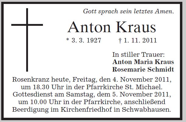 Rosenkranz am Freitag, dem 04.11.2011, um 18.30 Uhr in St. Michael Gottesdienst am Samstag, dem 5.11.2011, um 10:00 Uhr in St. Michael anschließend Beerdigung im Kirchenfriedhof Schwabhausen