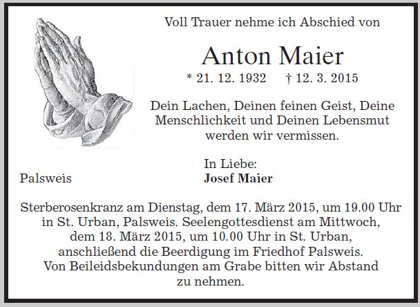 Der Gottesdienst findet statt am Mittwoch, dem 18. März 2015, um 10:00 Uhr in St. Urban in Palsweis. Die Beerdigung ist im Anschluß um 10:45 Uhr auf dem Kirchenfriedhof in Palsweis.