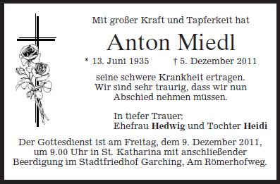 Gottesdienst am Freitag, dem 9. Dezember 2011, um 09:00 Uhr in St. Katharina Beerdigung anschließend im Stadtfriedhof Garching Am Römerhofweg